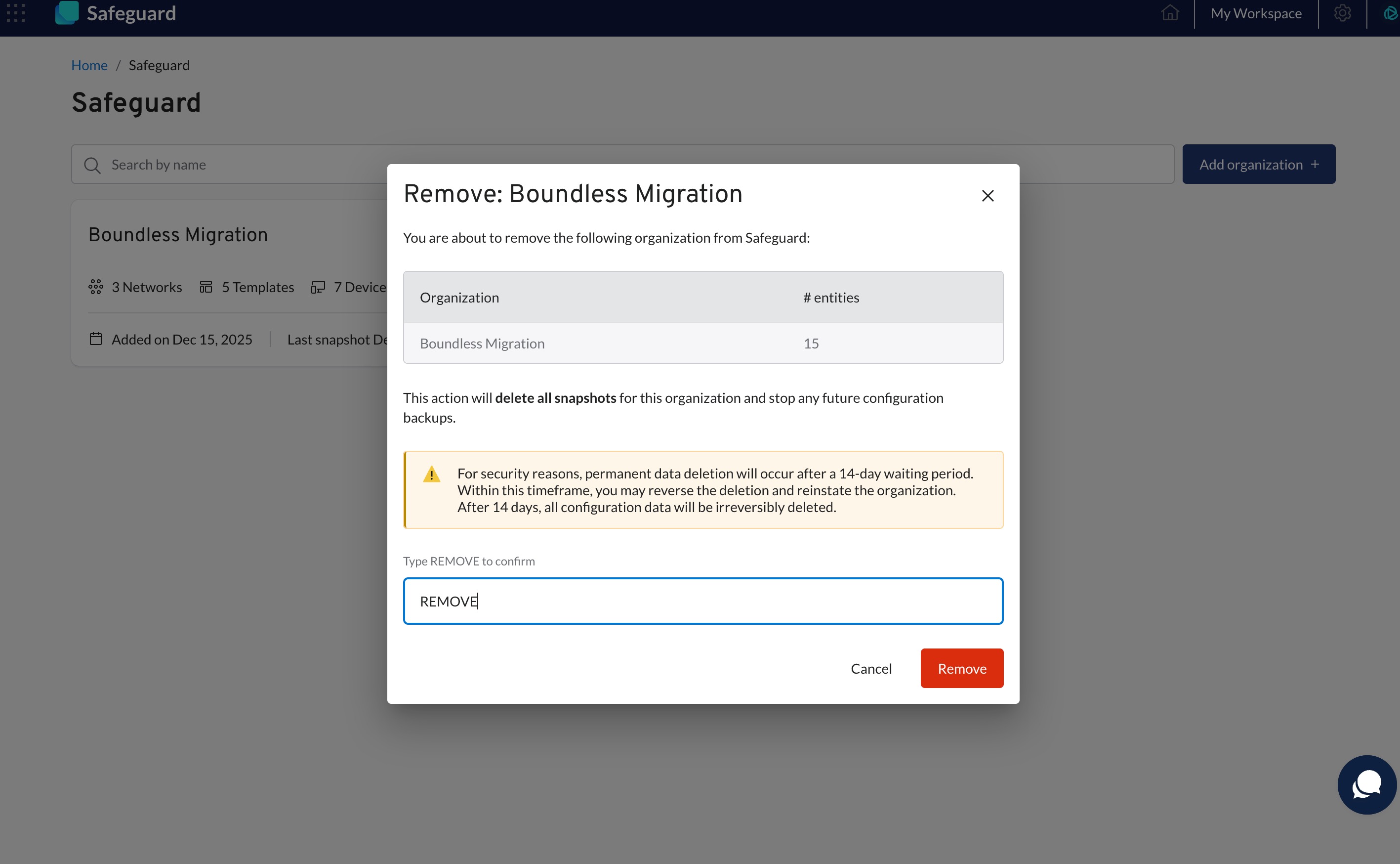 - Understand the implications: Removing an organization stops all backups and schedules deletion of all snapshots