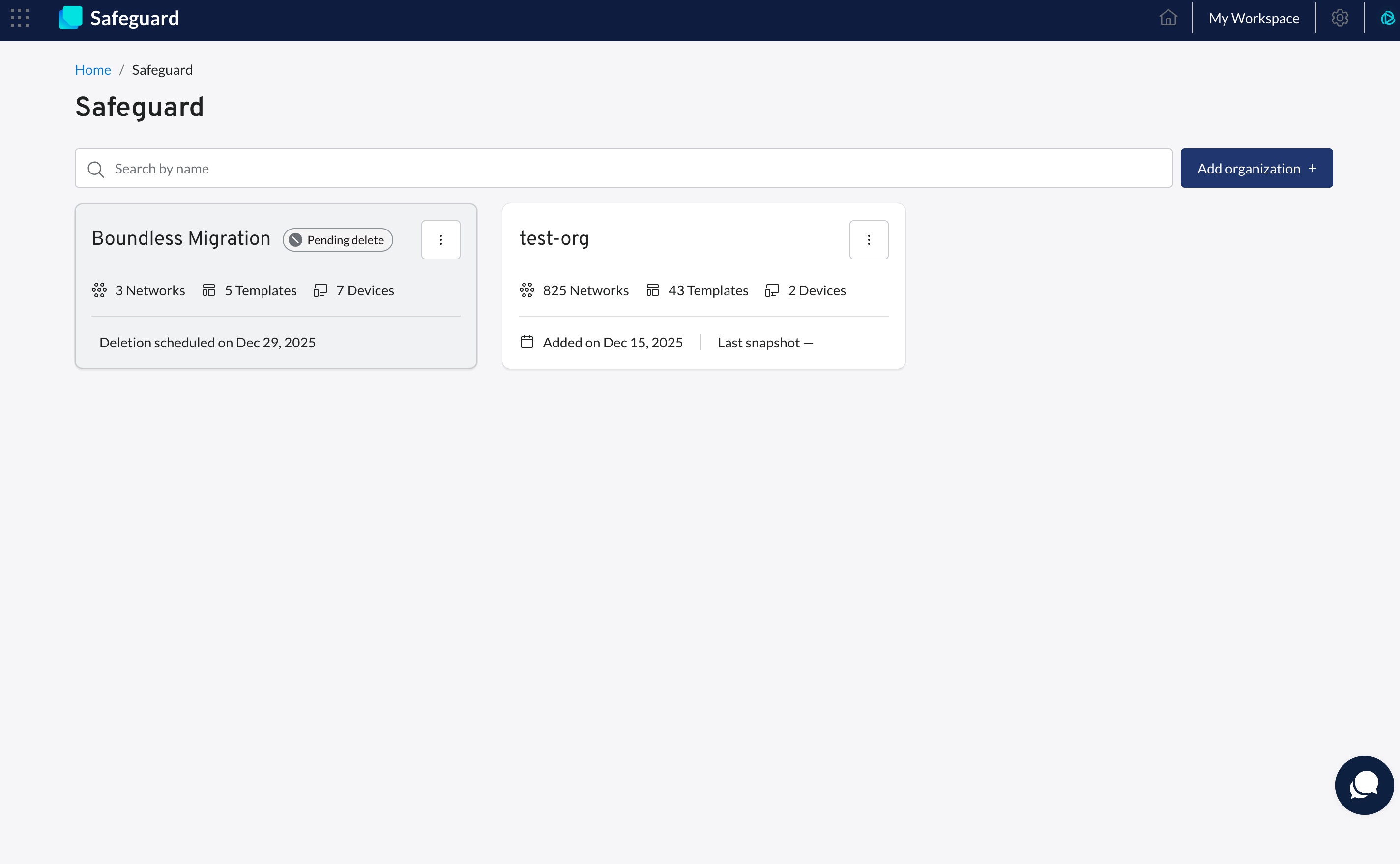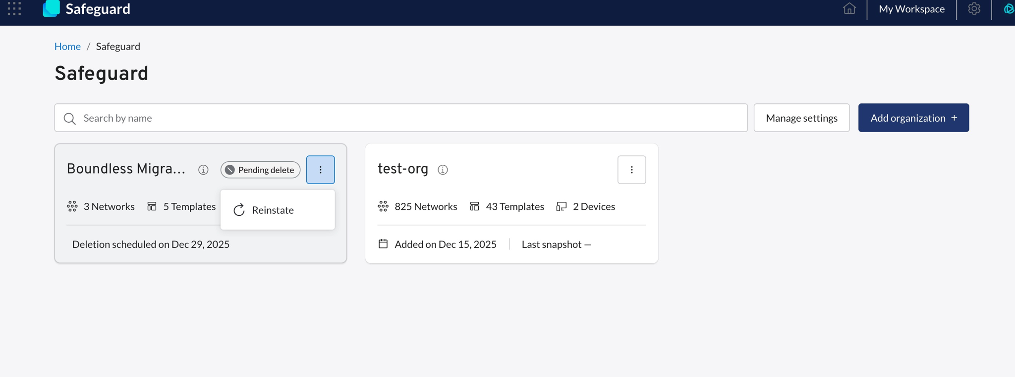 A: Don't worry! Simply reinstate the organization within 14 days by clicking the "Reinstate" button. All networks, templates, and existing snapshots will be fully restored.