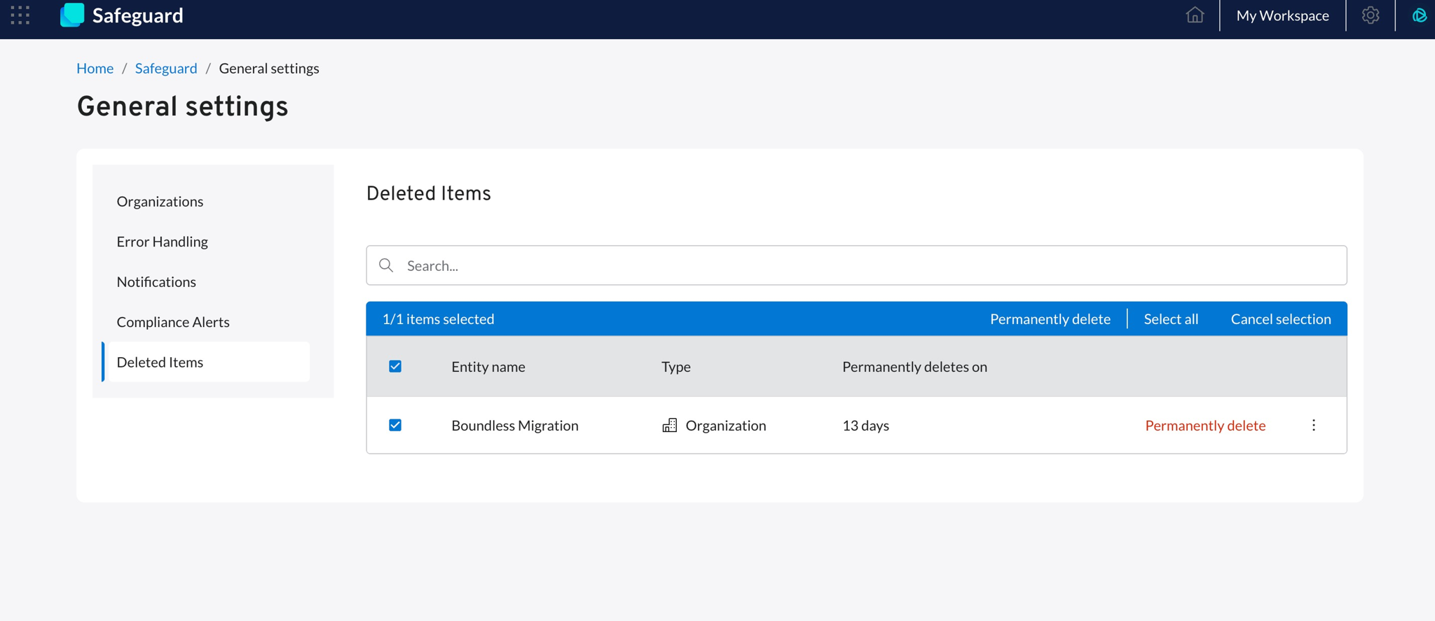 - Monitor deletion status: Check the organization card to see days remaining before permanent deletion.